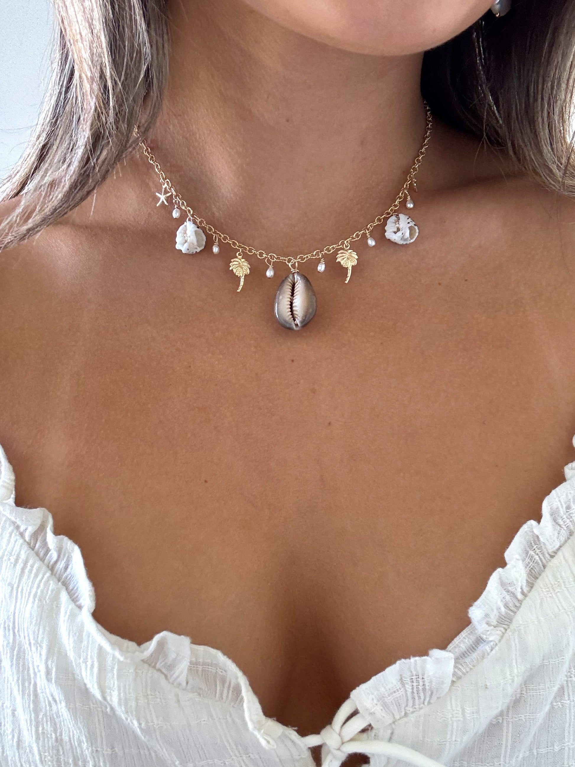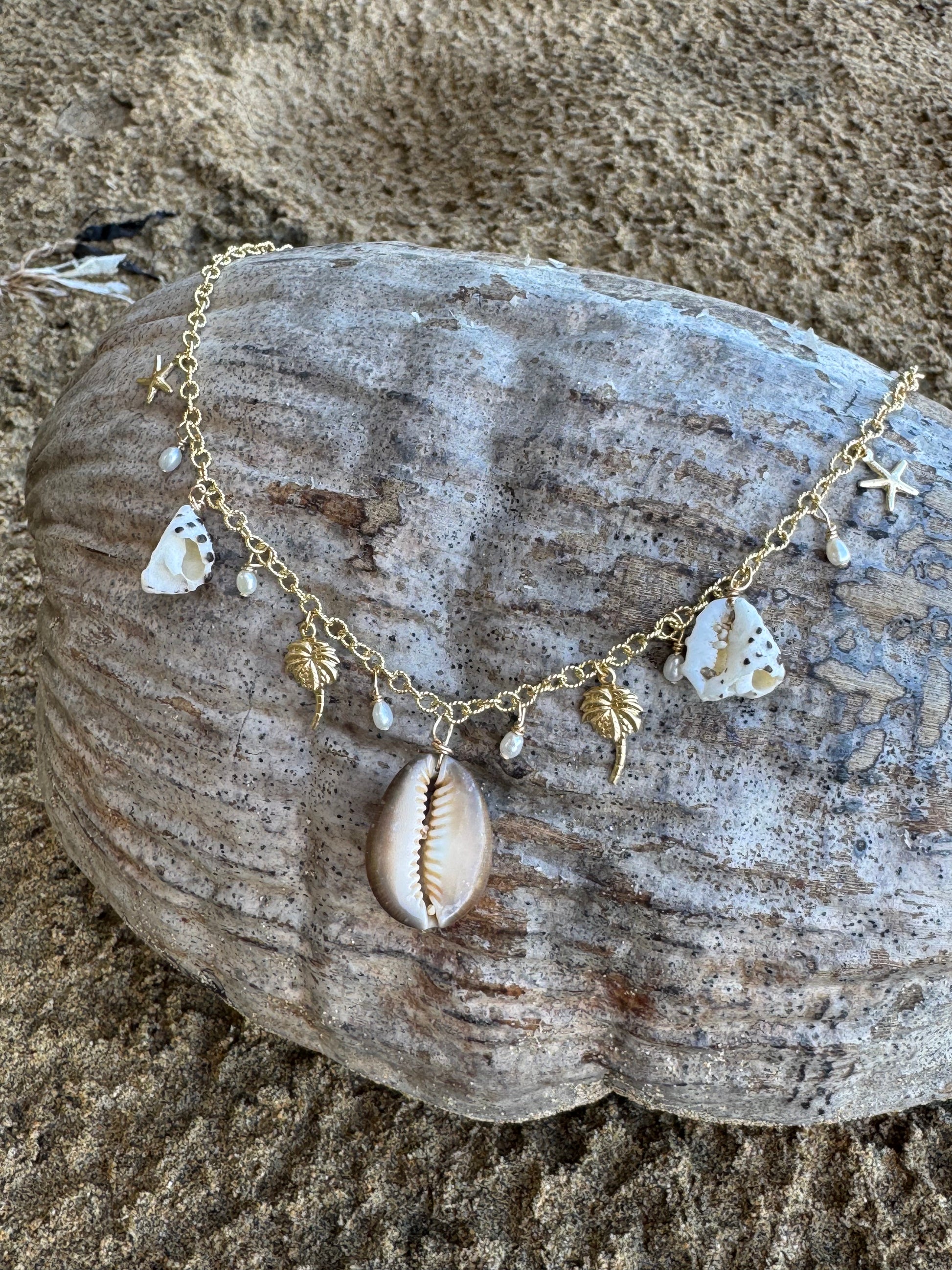 This delicate piece features handpicked mulberry drupes and a snakehead cowry shell, carefully wrapped by hand. The natural textures, freshwater pearls, and golden details evoke the raw, sun-kissed coastline of Haleʻiwa, adding an effortless island charm to any look. Whether layered or worn solo, this necklace is a wearable memory of sand, sea, and slow moments!