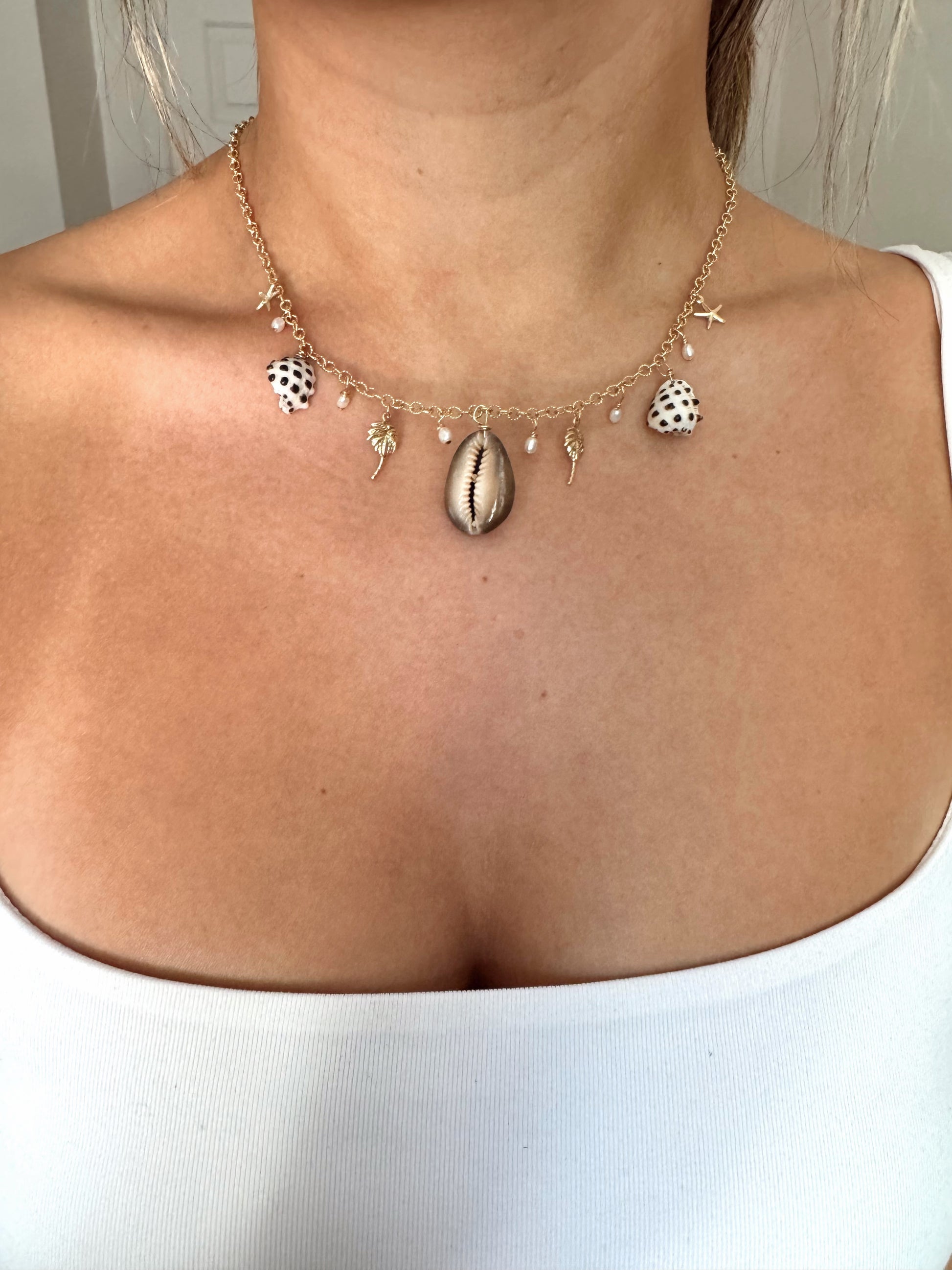 Materials: Natural mulberry drupe, snakehead cowry, 14K gold-filled textured chain, freshwater rice pearls, 14K gold-filled lobster clasp