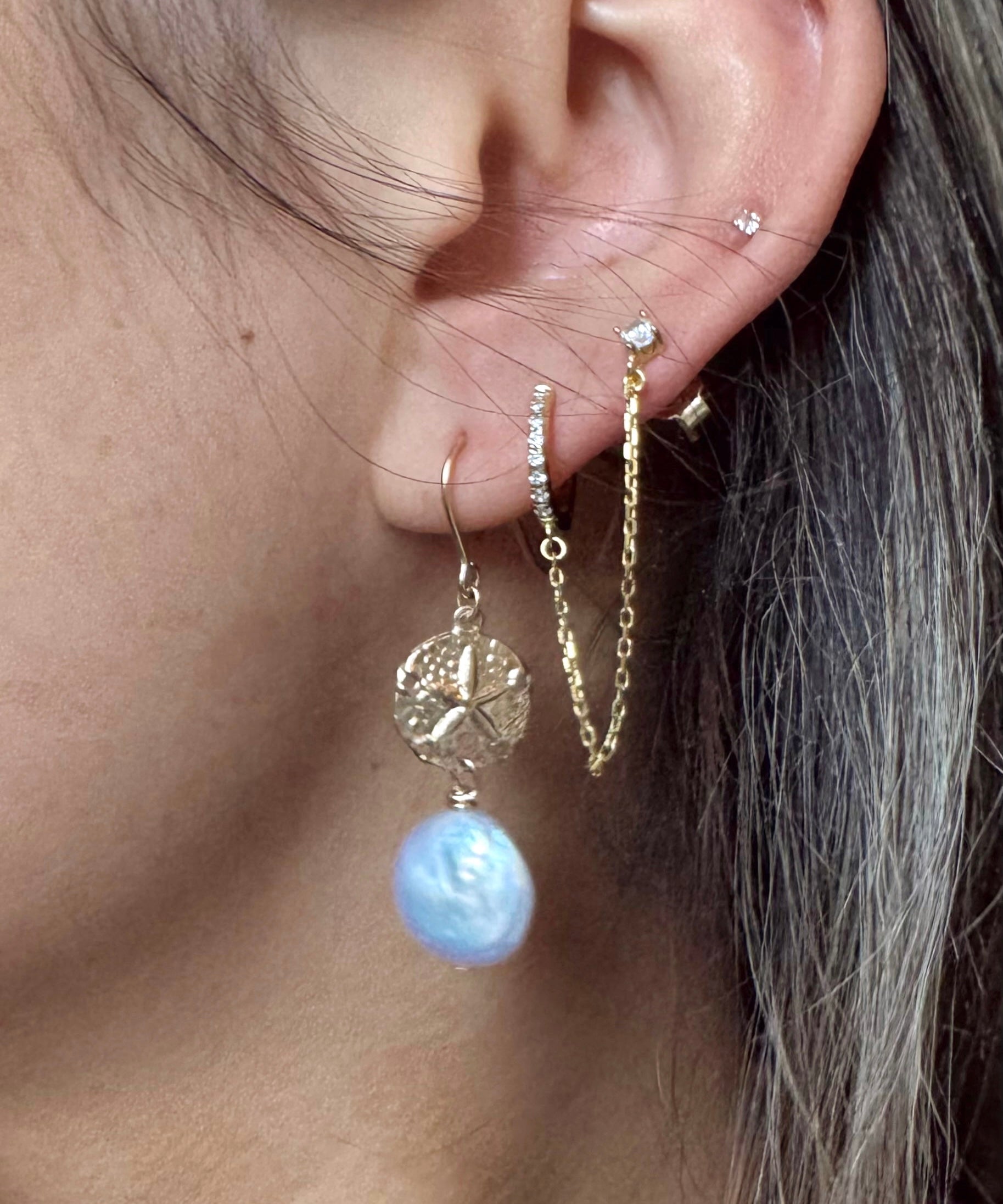 Each earring features a radiant freshwater coin pearl paired with a textured gold-filled sand dollar charm, reflecting the gentle shimmer of the Hawaiian shoreline. Lightweight and minimal, they bring a breezy elegance that works for every occasion.