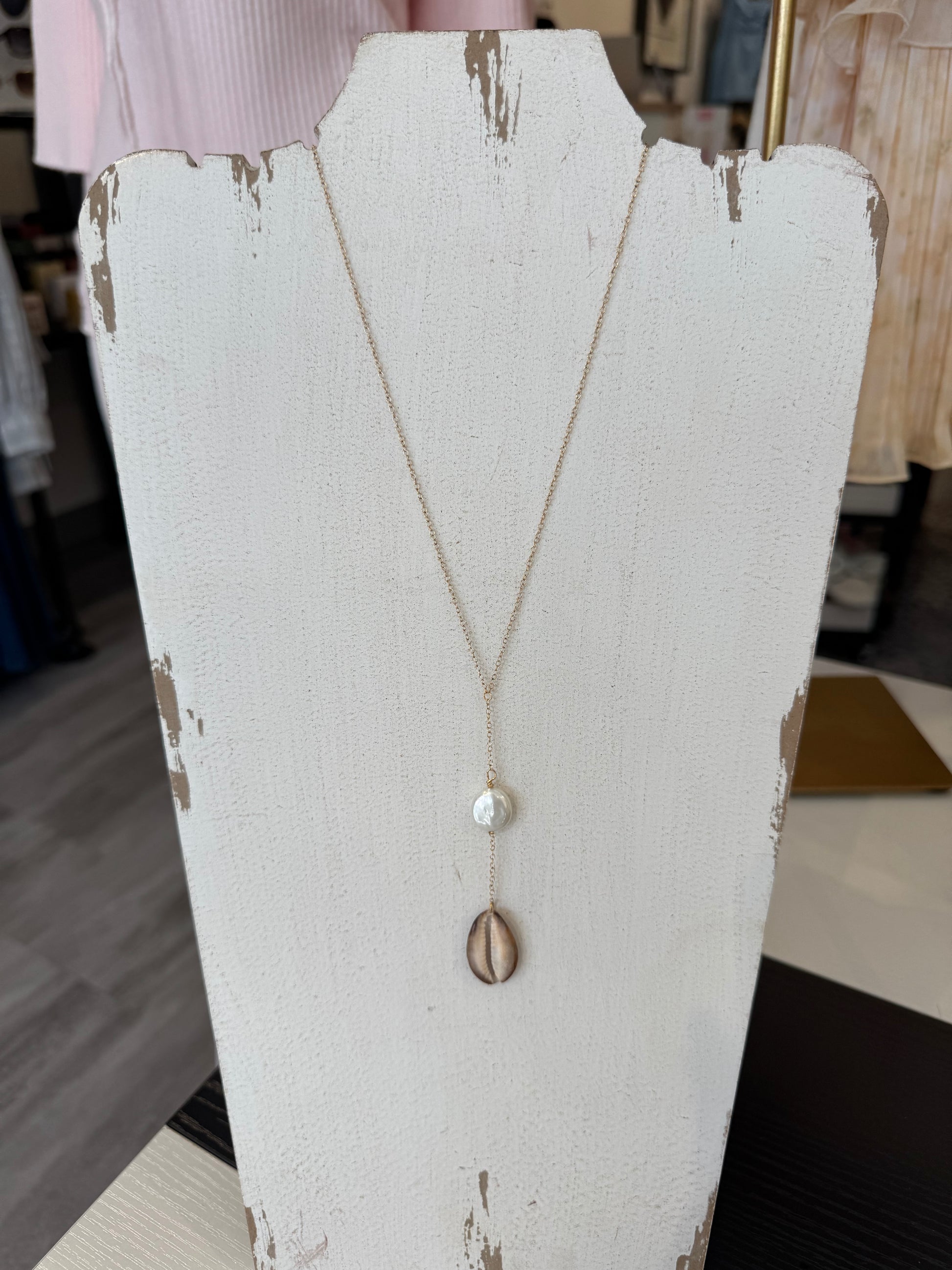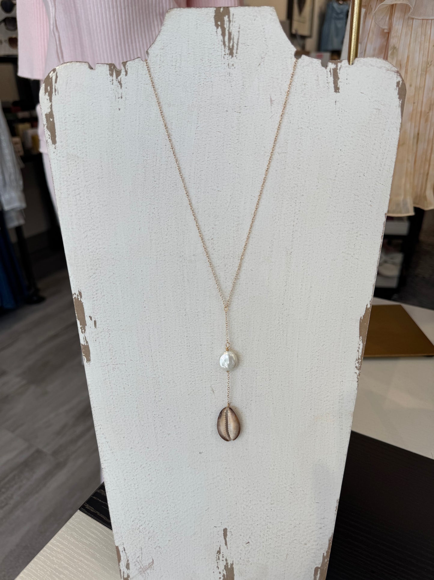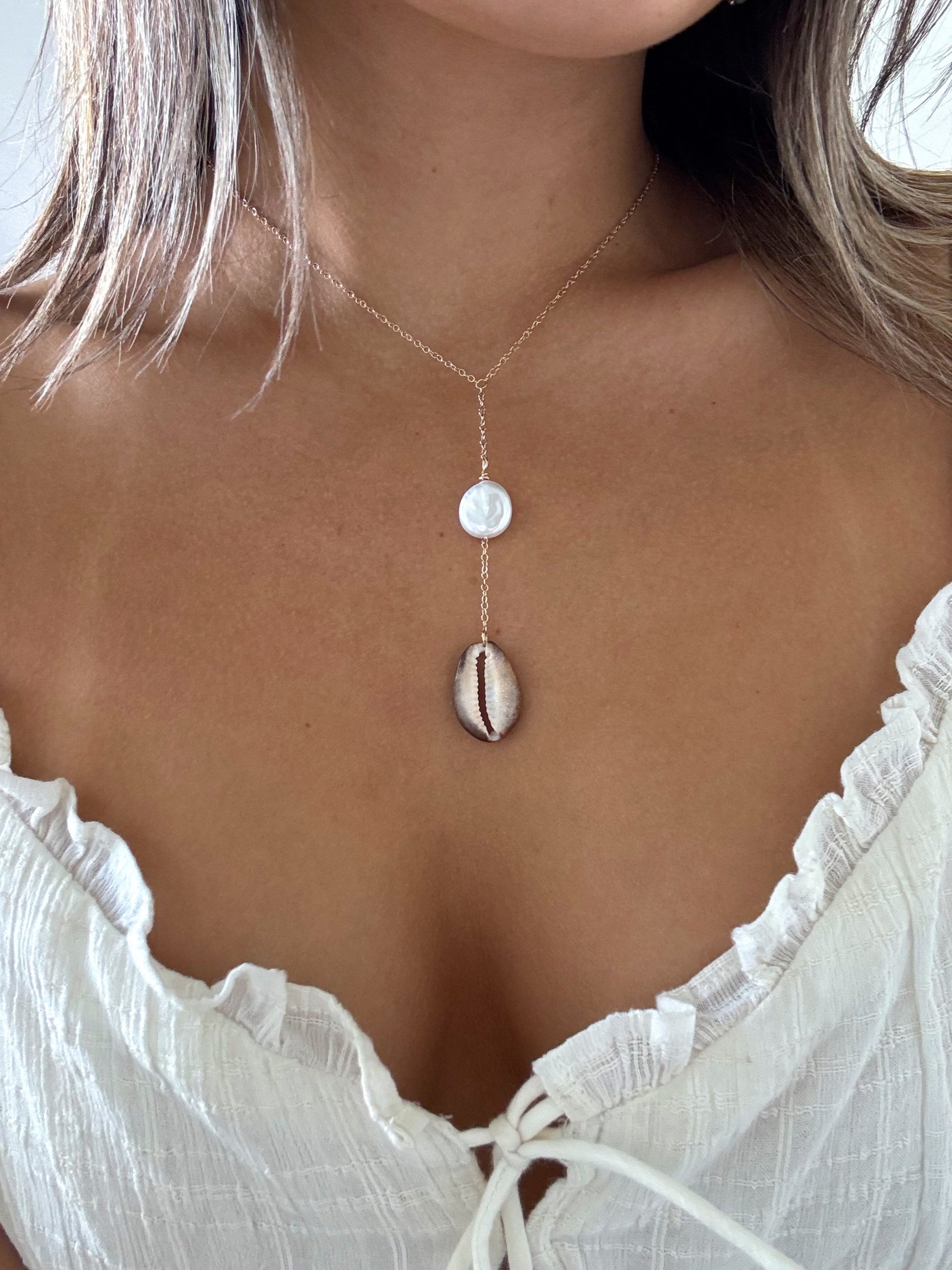 Featuring a soft freshwater coin pearl and natural half-snakehead cowry shell suspended on a delicate gold-filled chain, this piece captures the effortless beauty of the ocean. Its Y-shape flatters every neckline, making it the perfect accent for beach days or sunset dinners alike.
