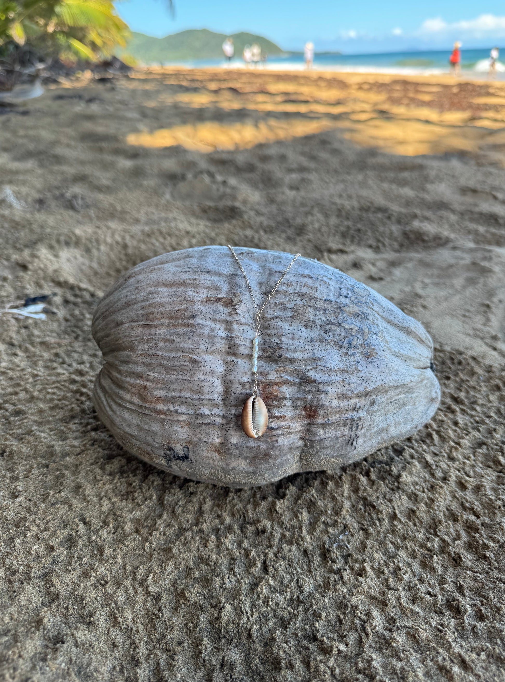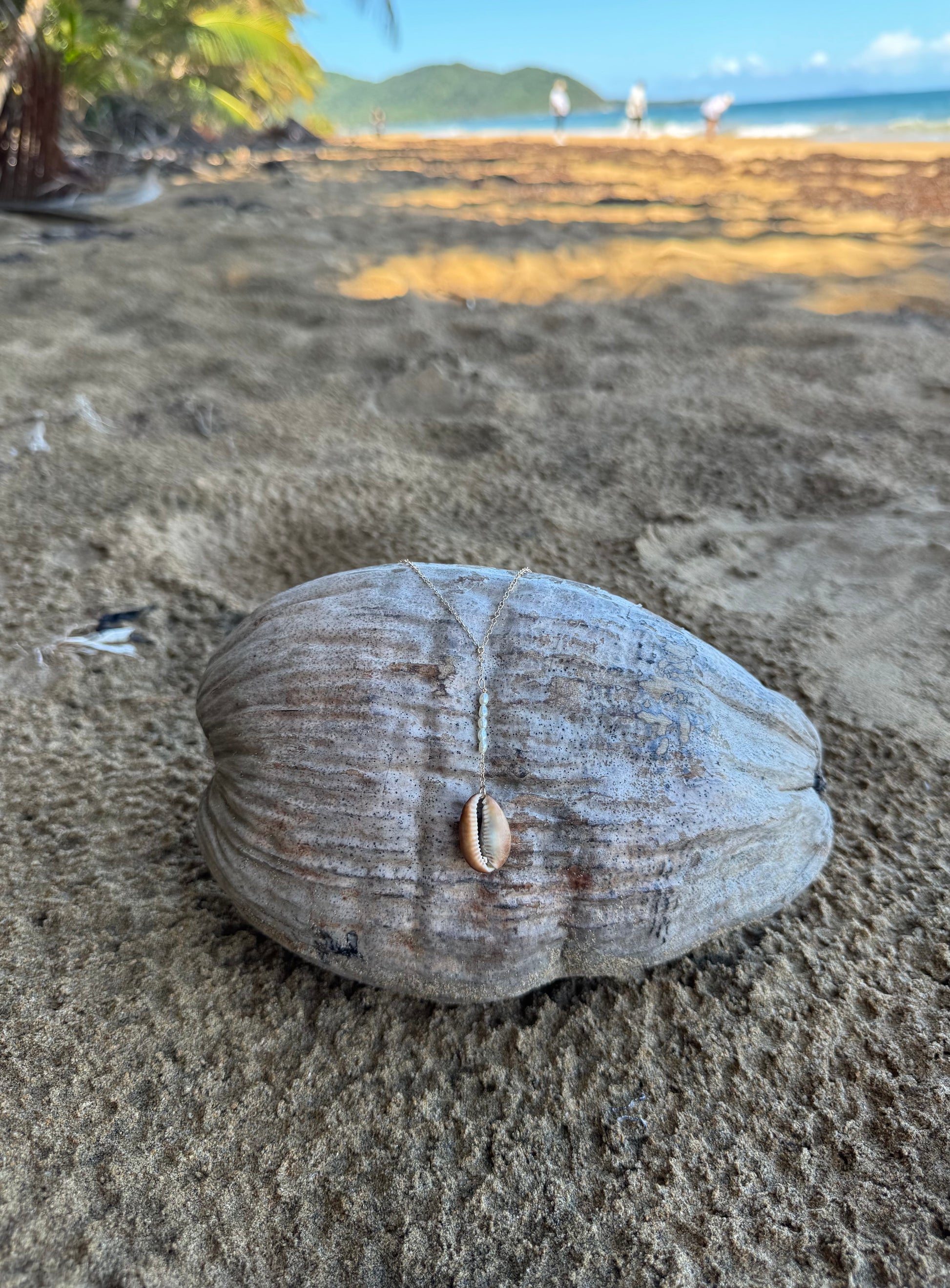 This minimalist piece features three dainty hand wrapped freshwater pearls leading into a polished natural half snakehead cowry shell, strung on a fine gold-filled chain. Inspired by the simplicity and beauty of life on Oʻahu, it adds a delicate island glow wherever you are.