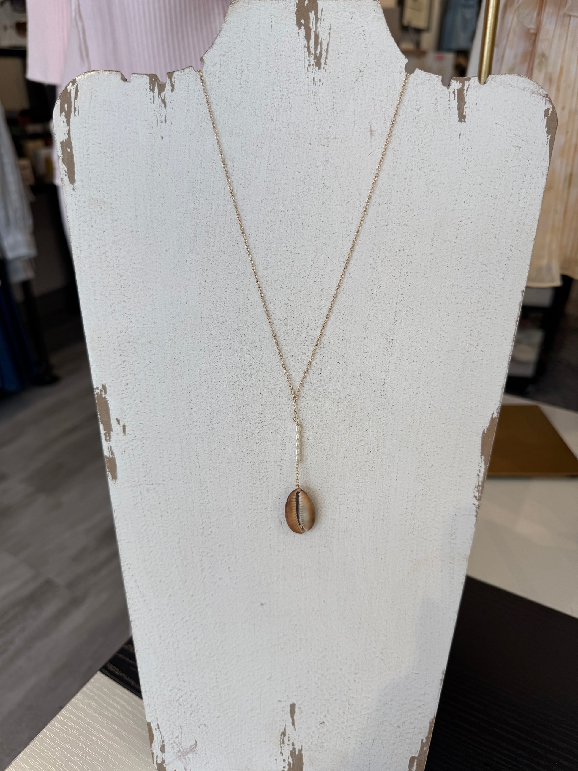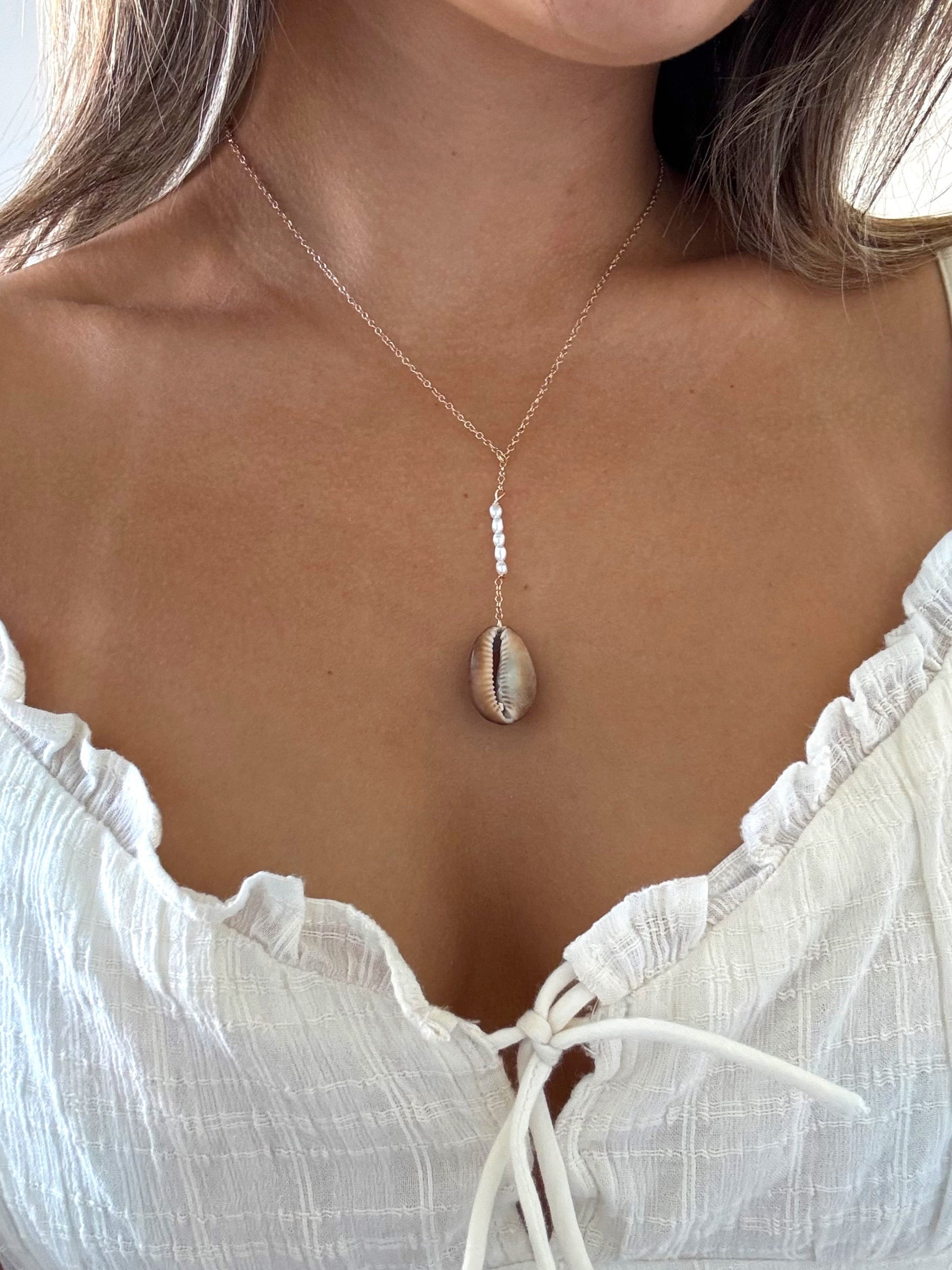 Materials: Freshwater pearls, natural half snakehead cowry shell, 14K gold-filled chain