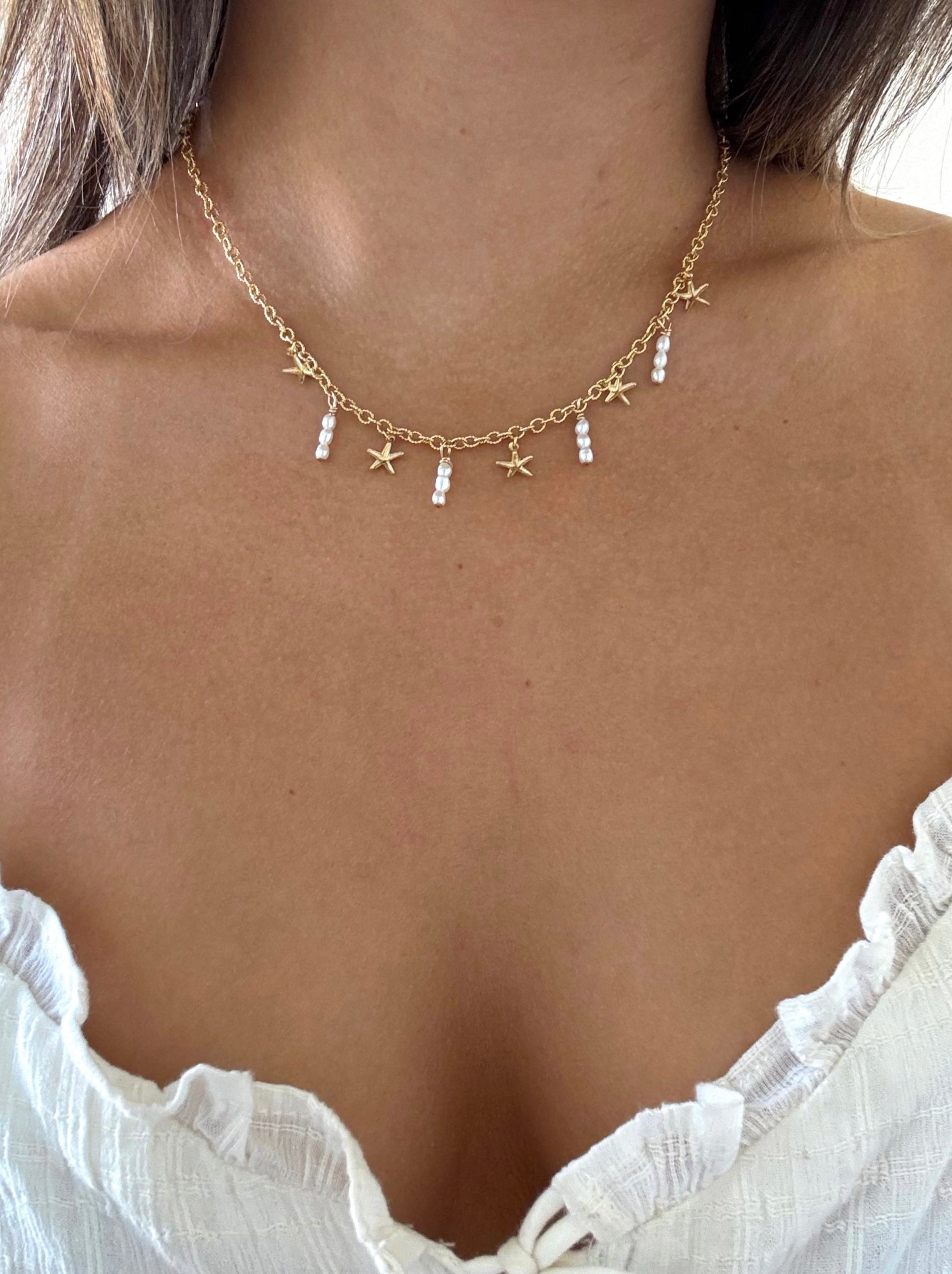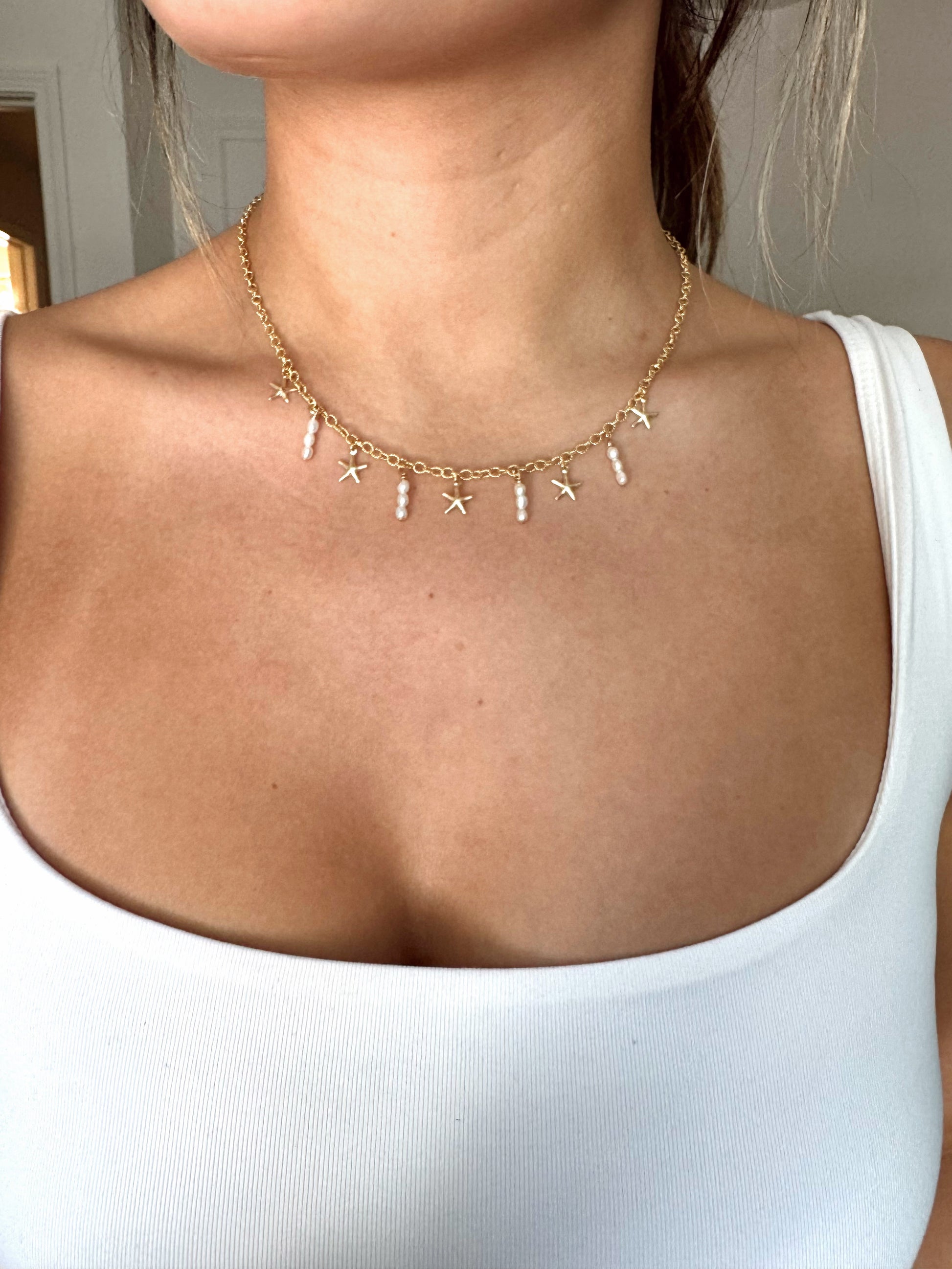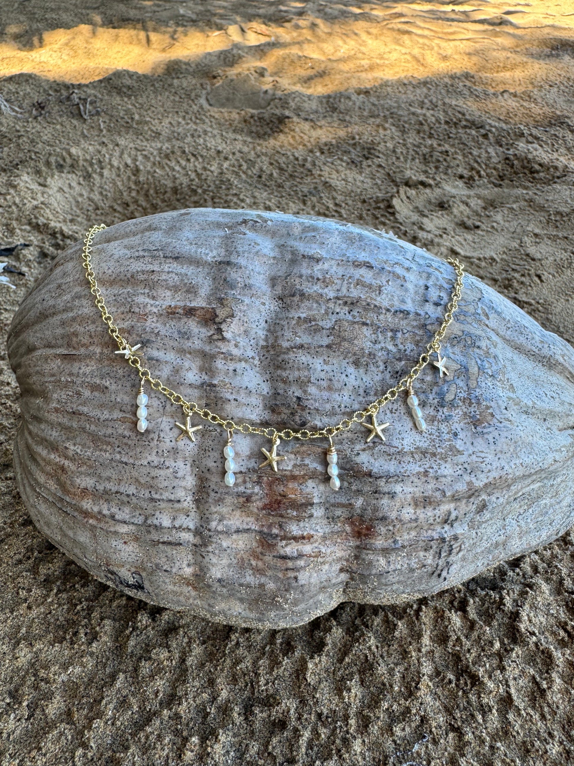 Materials: Freshwater pearls, 14K gold-filled chain, 14K gold-filled starfish charms, 14K gold-filled lobster clasp