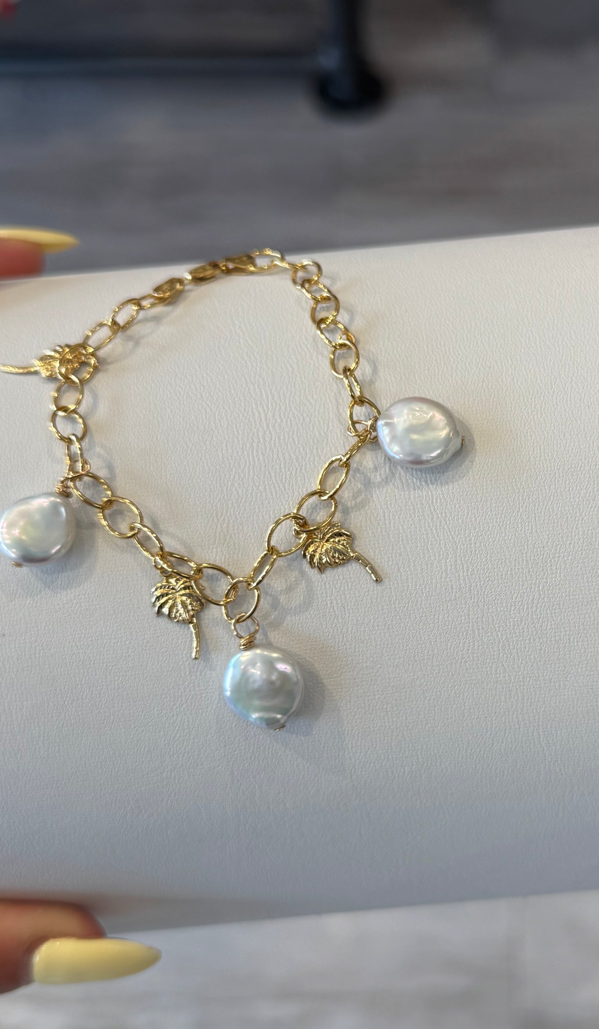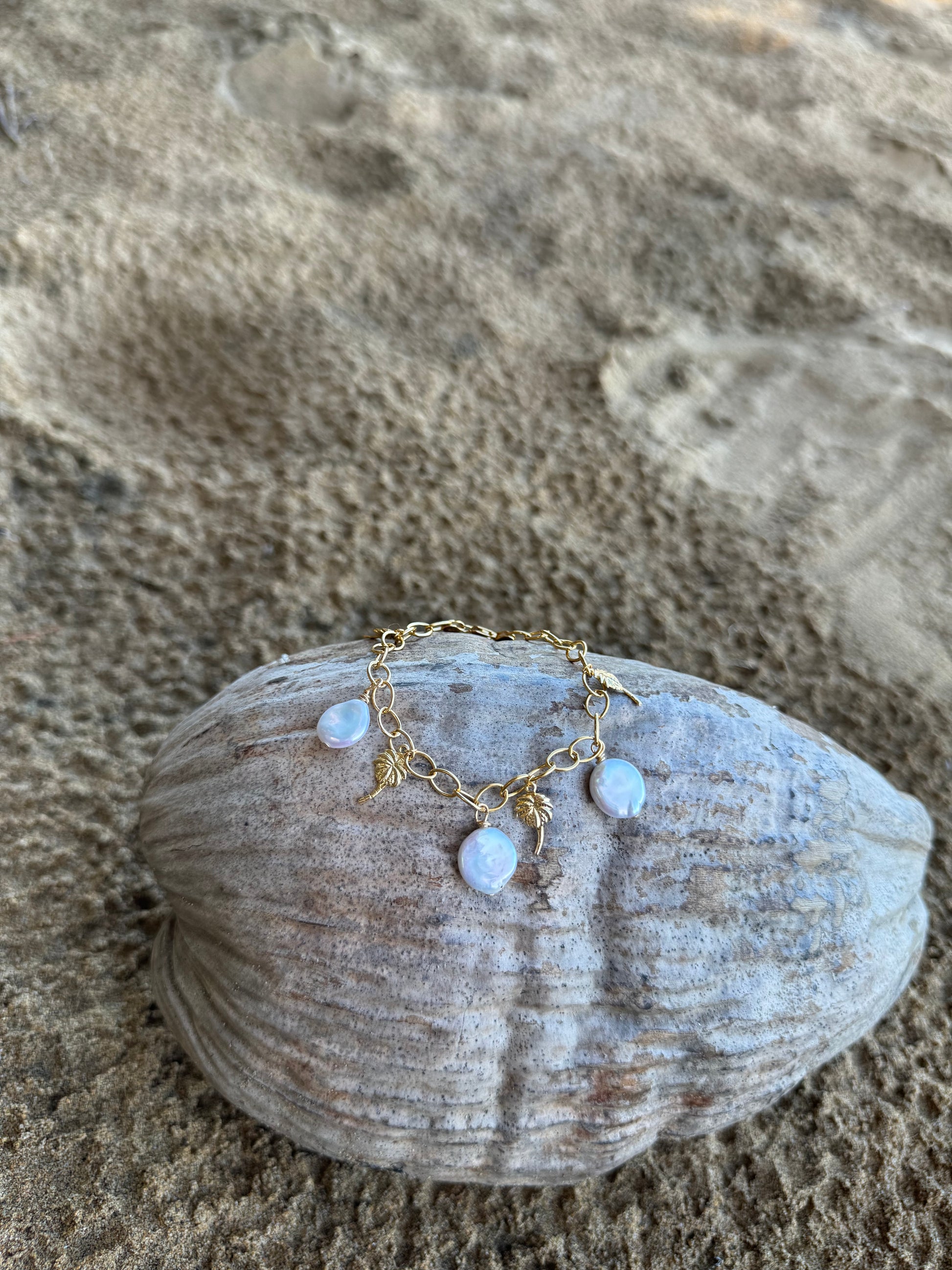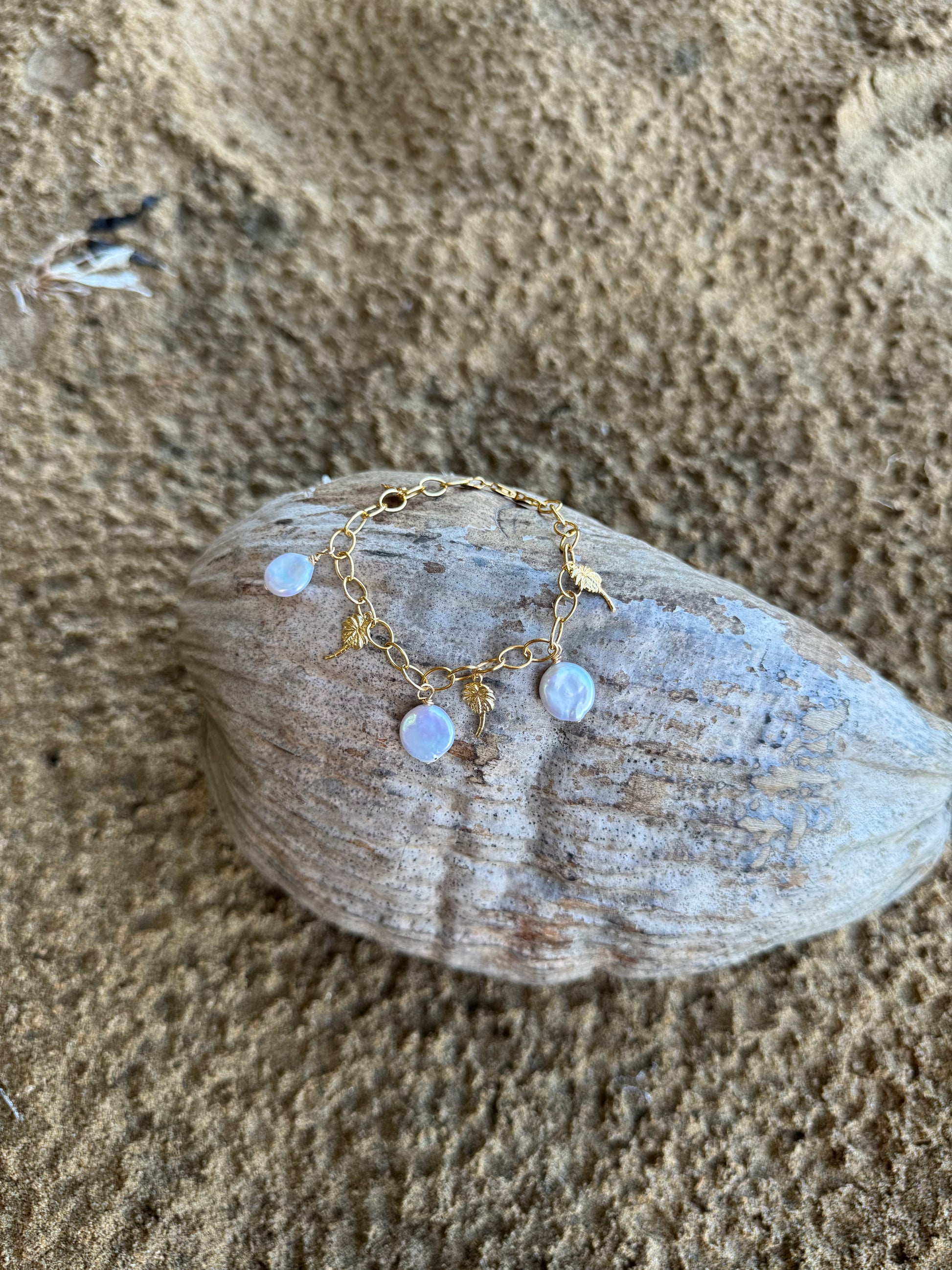 Materials: Freshwater coin pearls, 14K gold-filled chain & clasp, 14K gold-filled charms