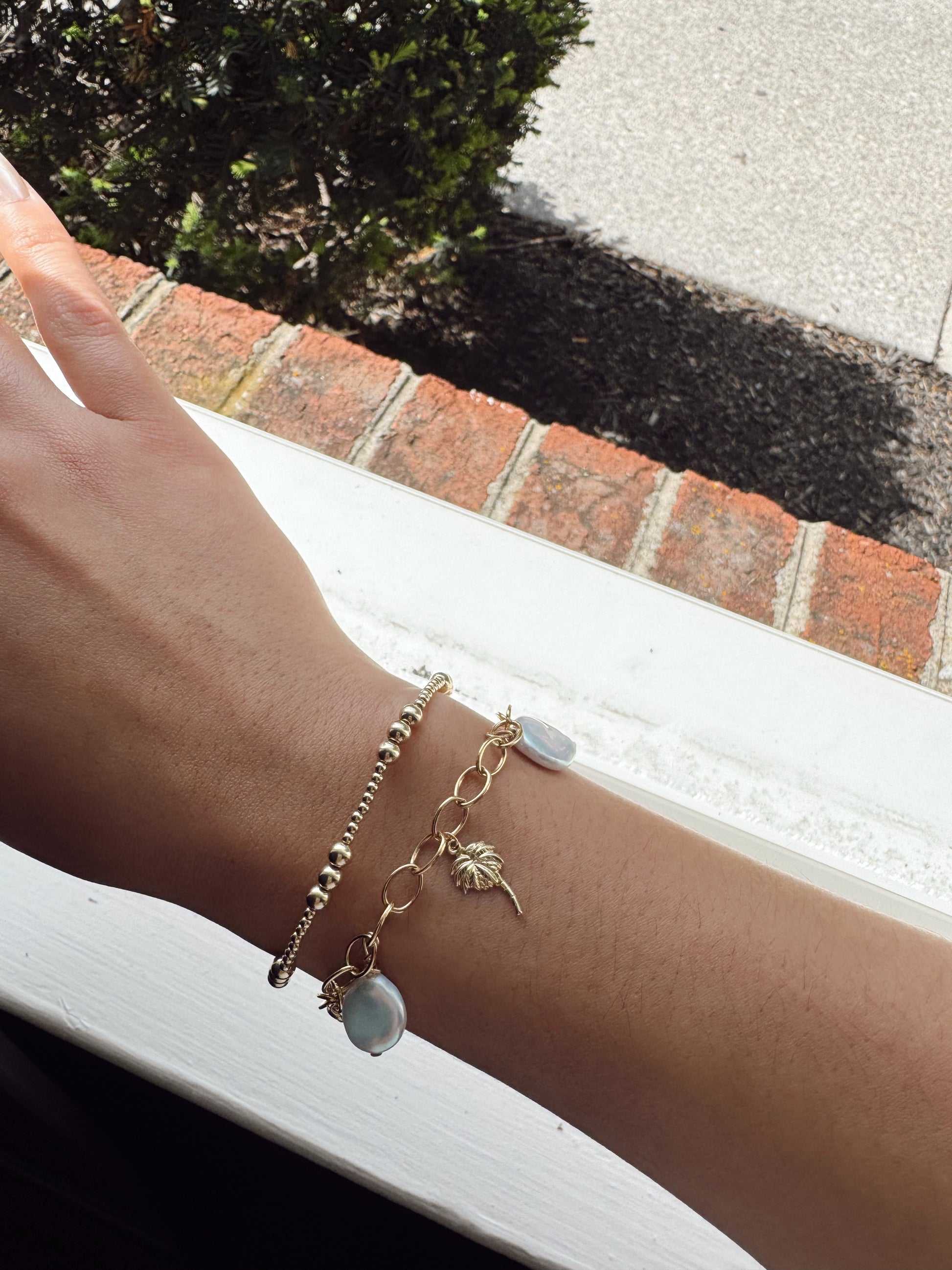With shimmering freshwater coin pearls and gold-filled palm tree charms dancing along a bold chain, this piece captures the spirit of sunlit strolls and waves crashing along the Waikīkī coast. Layer it up or let it shine solo — it’s made to move with you.